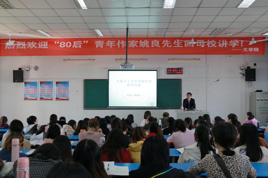 10月18日下午,我校60周年校庆期间,文学院2008级戏剧影视文学专业优秀校友、中国人民大学文学硕士、青年作家姚良回到学校并应邀做客国鼎大讲堂,在1307教室作了一场题为《中国当下文学的新时代精神内涵》的学术报告。报告会由文学院院长何梅琴主持,120余名师生参加了报告会。